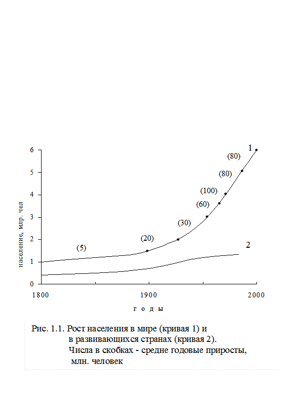 Резкое ускорение темпов роста народонаселения получило название «демографического взрыва ». Так, в течение 40 последних лет население Земли удвоилось. В 1999 г. оно достигло 6 млрд. человек и продолжает увеличиваться дальше (рис. 1.1.).