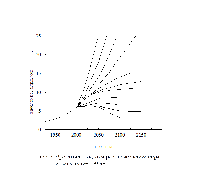 Согласно расчетам, население мира увеличивается сегодня ежедневно на 250 тыс. человек, на 1 млн. 750 тыс – еженедельно, на 7,5 млн. – ежемесячно и на 80-90 млн. человек ежегодно. При этом основной прирост приходится на развивающиеся страны, что особенно резко обостряет экологические и социально-экологические мировые проблемы, включая пресную воду и продукты питания. Прогнозные сценарии роста населения Земли на ближайшие 150 лет показаны на рис. 1.2.