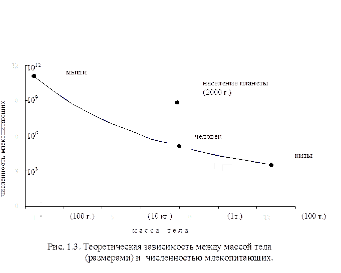 Насколько неестественно выглядит такая высокая численность народонаселения в условиях Земли легко убедиться на следующем примере. Согласно законам естественного отбора, действующим в природе, для видов млекопитающих, к числу которых относится и человек, существует достаточно четко выраженная отрицательная зависимость между массой тела и числом особей. Это означает, что виды мелких животных имеют более высокую численность по сравнению с видами крупных животных (рис.1.3.).