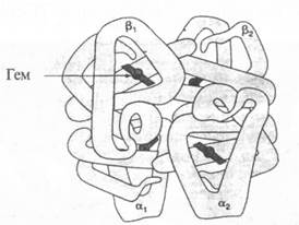 Рис. 6.3. Трехмерная структура гемоглобина. Каждая молекула состоит из четырех полипептидных цепей — двух альфа-цепей и двух бета-цепей. Эти цепи, комплементарные друг другу, образуют четвертичную структуру белка. В каждой цепи имеется по большому гему с атомом железа в центре; именно к нему присоединяется кислород