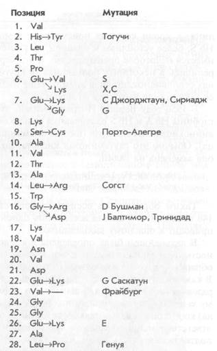 Рис. 6.5. Последовательность первых 28 аминокислот нормальной бета-цепи гемоглобина человека с указанием возможных замен аминокислот в результате мутации. Одни мутации обозначаются буквами, другие — названиями мест, где были обнаружены страдающие этими наследственными нарушениями. Одна из мутаций представляет собой отсутствие аминокислоты