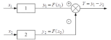 Дифференциальная схема состоит из двух каналов с последовательно соединением преобразователей, причем выходные сигналы каждого канала подаются на два входа вычитающего преобразователя. Вычитающий преобразователь имеет два входа, а выход – разность величин этих входов.