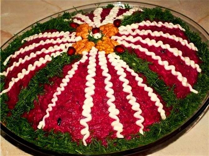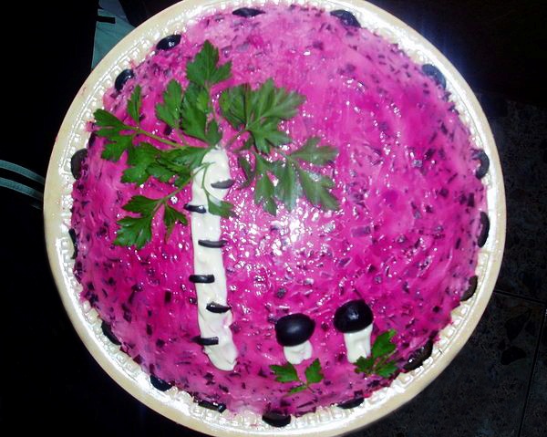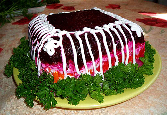 Каждый слой смазывать майонезом, а последний слой посыпать тертой свеклой.