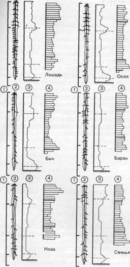 | Рис. 7. Артериальная сосудистая система спинного мозга домашних парнокопытных (Lazorthes e. а., 1967). 1 — ось позвоночника с относительной длиной различных сегментов; 2 — спинной мозг, вид спереди; схематическое изображение передней спинальной артерии с усиливающими ее корешковыми артериями; 3 — число сулькальных артерий на 1 см спинного мозга; 4 — число сулькальных артерий на сегмент спинного мозга. |
