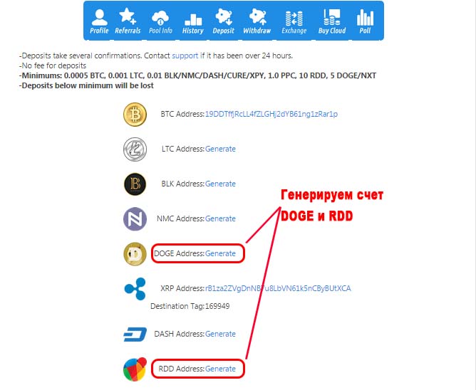 Нажимаем Deposit и создаем еще два щета DOGE и RDD: