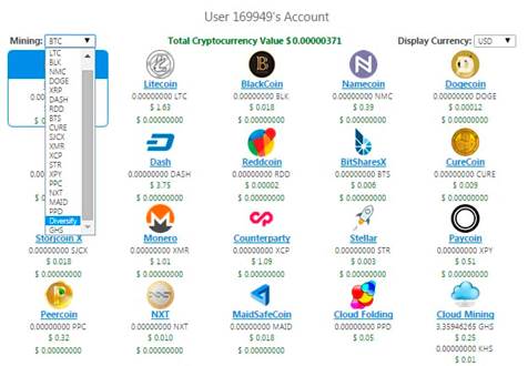 Все, облако у нас есть теперь нужно чтоб оно расло и принасило прибыль. Ведь чем больше облако тем быстрее растет прибыль. В «Mining» выбираем « Diversify»