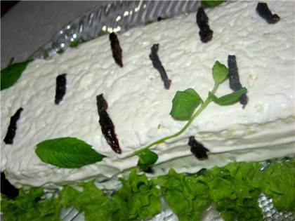 9. Когда весь торт собран, смазать его хорошенько майонезом со всех сторон. Бока посыпать тертым сыром, поверхность тертым белком. А дальше украшайте, как вам подскажет воображение.