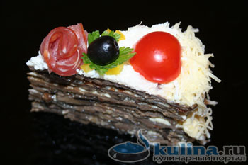 8. Хорошенько посыпаем грибами с луком и таким образом, собираем весь торт, последним должен быть печеночный корж.