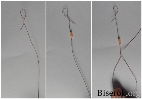 Начинаем плести лепесток с помощью техники французского плетения цветов. Отрежьте проволоку длиной около 50 см. Сделайте маленькую петельку с одного края, наберите 4 бисеринки и скрутите большую петлю с другой стороны так, как показано на фото.