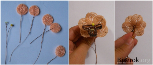 Для одного цветка вам нужно сплести 5 одинаковых лепестков, 1 тычинку с крупной желтой бисеринкой, тычинку с двумя мелкими желтыми бисеринками и центральные мелкие лепестки из коричневого бисера. Две боковинки состоят из двух дуг и центрального ряда из 8 бисерин, а центральный лепесток из четырех дуг (по 2 с двух сторон), а центральный ряд из 6 бисерин.