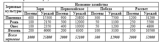 В динамической (электронной) таблице приведены значения посевных площадей (в га) и урожая (в центнерах) четырех зерновых культур в четырех хозяйствах одного района. В каком из хозяйств достигнута максимальная урожайность зерновых (по валовому сбору)? (Урожайность измеряется в центнерах с гектара.)