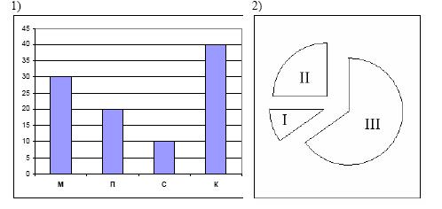 Торговое предприятие владеет тремя магазинами (I, II и III), каждый из которых реализует периферийные компьютерные устройства: мониторы (М), принтеры (П), сканеры (С) или клавиатуры (К). На диаграмме 1 показано количество проданных товаров каждого вида за месяц. На диаграмме 2 показано, как за тот же период соотносятся продажи товаров (в штуках) в трех магазинах предприятия.