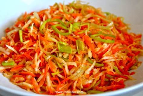 Сельдерей и морковь потереть на крупной тёрке. Лук-порей порезать очень тонкими кольцами. Посолить, полить лимонным соком, заправить оливковым маслом, перемешать, и вуаля – салат готов!