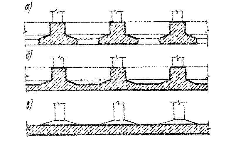 Сплошную плиту фундамента под малоэтажные дома проектируют только в случае строительства здания на грунтах с неравномерной осадкой или вспучиванием при высококм стоянии уровня грунтовых вод (для зданий с подвалом).Плиту выполняют из монолитного железобетона, толщиной не менее 100мм, толщину определяют расчетом. Для домов без подвала плиту устанавливают на песчанную подушку, что уменбшает неравномерность осадки грунтов.