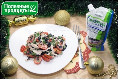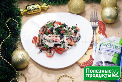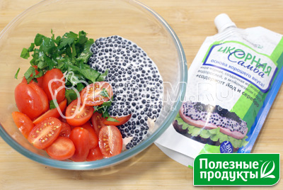 Добавить мелко нарубленную зелень петрушки и черную икру из морских водорослей в майонезном соусе «Икорная самба», которая идеально подходит для заправки салатов и придает им необычное звучание. Кстати, её калорийность всего 91 ккал на 100 грамм!