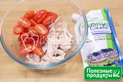 Мясо разделит по волокнам, помидорчики нарезать на половинки. Сложить вместе в миску.