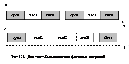 Кроме того, каждая операция включает ряд уникальных для нее действий, например, чтение определенного набора кластеров диска, удаление файла и т. п. Операционная система может выполнять последовательность действий над файлом двумя способами (рис. 13.8):
