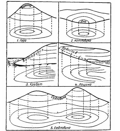 На физической поверхности Земли встречаются различные неровности, которые в своей совокупности образуют рельеф местности. Рельеф в природе слагается из различных сочетаний основных форм. Основными формами рельефа являются: гора, котловина, хребет, лощина и седловина (рис.3.6).