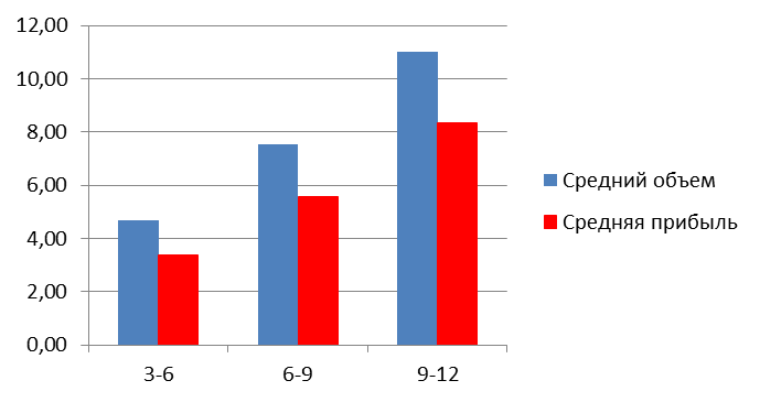 Для наглядности средние объем капитала и прибыль из Табл. 1.3 представим диаграммой.