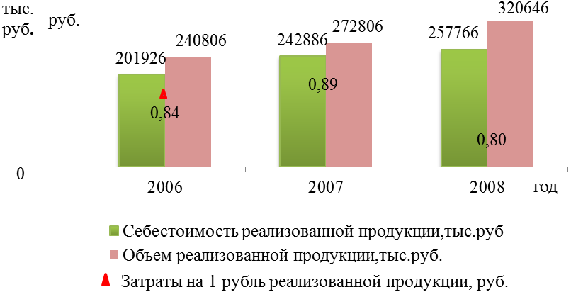 В 2006 году затраты на 1руб. реализованной продукции составили 0,84 руб., в 2007 году 0,89руб., а в 2008 году 0,80 руб. Положительная динамика показателя свидетельствует о том, что темпы роста объема реализованной продукции превышали темпы роста себестоимости реализованной продукции, но менее быстрыми темпами чем по товарной продукции. Для того чтобы воздействовать на объем реализованной продукции необходимо увеличить объем производства и сократить остатки нереализованной продукции.