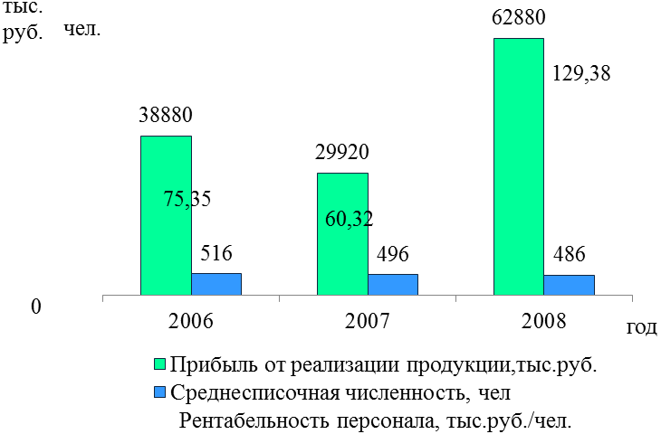 Таким образом, анализируя данный график необходимо отметить, что прибыль на 1 работника снизилась в 2007 году на 19,95% и составила 60,32 тыс.руб, в 2008году наблюдается тенденция к росту рентабельности персонала на 114,49%. Это связано с тем, что в 2008 году происходит рост прибыли от реализации ,а численность работающих сокращается. Т.о. в 2008 году на одного работающего приходится 129,38 тыс.руб. прибыли.