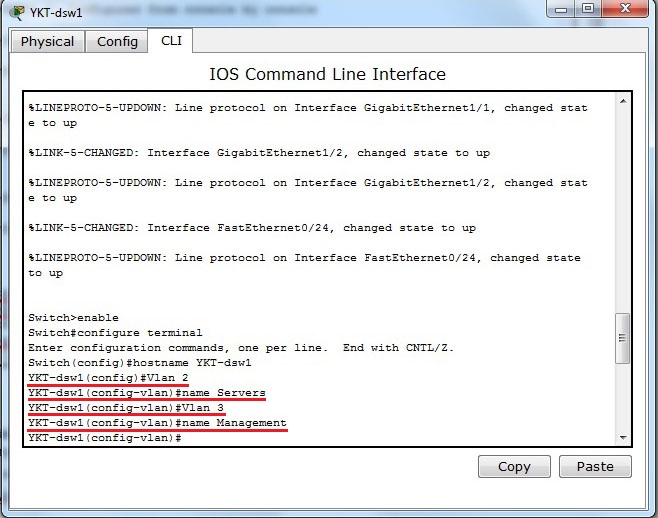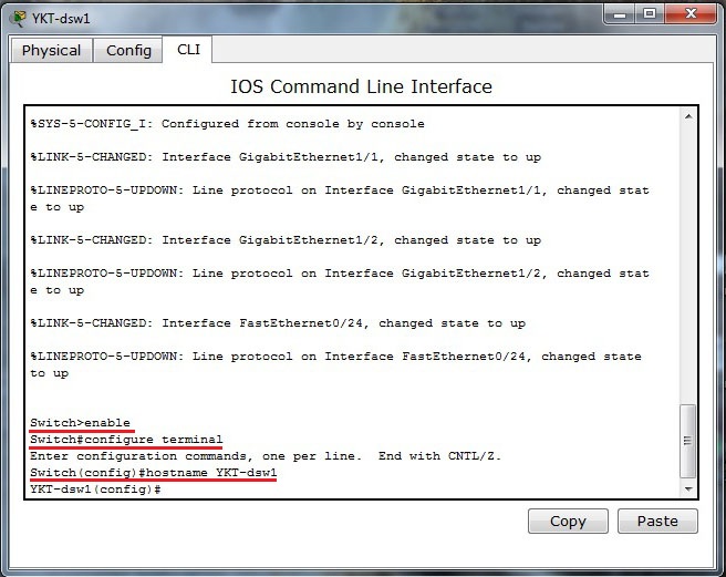 2) Создаем VLAN.2.1) С помощью нажатия левой кнопки на Switch (YKT- dsw1) и выбора вкладки CLI открываем IOS Command Line Interface. С помощью команды enable(Switch>enable)входим в привилегированный режим. Заходим в режим глобальной настройки с помощью команды configure terminal (Switch#configure terminal). Настраиваем hostname с помощью команды (Switch(config)#hostname YKT-dsw1).