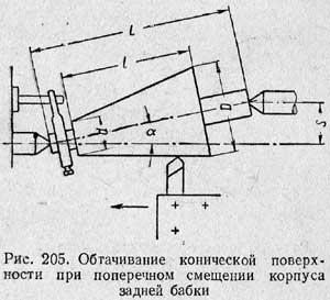 Для получения конической поверхности на токарном станке необходимо при вращении заготовки вершину резца перемещать не параллельно, а под некоторым углом к оси центров. Этот угол должен равняться углу α уклона конуса. Наиболее простой способ получения угла между осью центров и направлением подачи — сместить линию центров, сдвинув задний центр в поперечном направлении. Путем смещения заднего центра в сторону резца (на себя) в результате обтачивания получают конус, у которого большее основание направлено в сторону передней бабки; при смещении заднего центра в противоположную сторону, т. е. от резца (от себя), большее основание конуса окажется со стороны задней бабки (рис. 205).