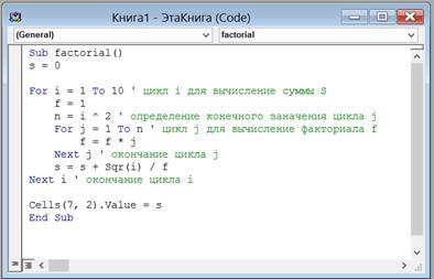 Т. к. в формуле S в знаменателе необходимо вычислить факториал для i2 , то применяется вложенный цикл j внутри главного цикла i вычисления суммы S.