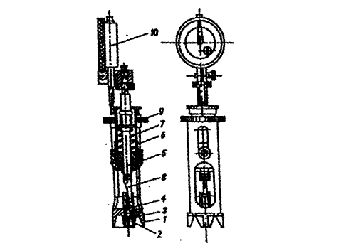 I-опора, 2 – гильза, 3 – эталон, 4 – гайка, 5 – тяга, 6 – корпус пружины, 7 – пружина, 8 – крюк, 9 – рабочая гайка, IO - индикатор