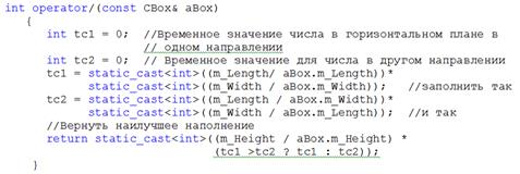 Оператор деления определяет, сколько объектов CBox, идентичных тому, который указан в правом операнде, может быть помещено в объекте CBox, указанном в левом операнде. Чтобы не слишком усложнять, предположим, что все объекты CBox упаковываются вверх, т.е. по вертикальному измерению. Также предположим, что все они выравниваются по длине. Без этих предположений все было бы несколько сложнее.