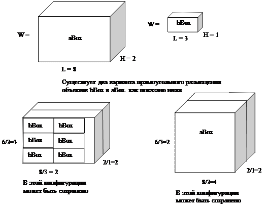 Мы рассматриваем две возможности: размещение ящика bВох в ящике аВох, когда длинные стороны первого выравниваются по длине второго, и когда длины ящика bВох выравниваются по ширине ящика аВох.