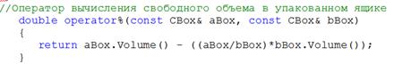 Другая аналитическая функция, оператор operator%(), предназначена для получения свободного объема в упакованном ящике аВох; она проще, поскольку вы можете использовать уже написанный оператор для ее реализации. Ее можно написать в виде обычной глобальной функции, так как здесь не нужен доступ к закрытым (private) членам класса.