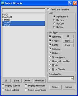 Для повышения эффективности выбора следует пользоваться выбором объектов по имени, который позволяет выбирать объекты, которые в данный момент даже не видны в рабочих окнах. Для этого можно использовать кнопку главной панели
