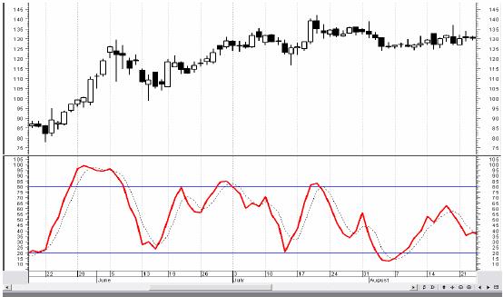Индекс относительной силы (RSI - relative strength index) является, наверное, самым популярным из осцилляторов данной группы. Индекс дает надежные сигналы перекупленности и перепроданности, а также производит модели долгосрочной дивергенции, которые могут быть использованы для выявления основных пиков и впадин. RSI может применяться как в качестве механизма получения дохода, так и инструмента тонкой настройки рыночных вхождений, получаемых в результате сигналов прочих методов. Значения индекса RSI наносят в пределах вертикальных координат от 0 до 100. Когда показатель выше 70 или ниже 30, индекс регистрирует состояние перекупленности или перепроданности соответственно. Значения 30 и 70 рекомендуется использовать при боковом тренде, а при ярко выраженных бычьем или медвежьем трендах обычно используют значения 20 и 80.
