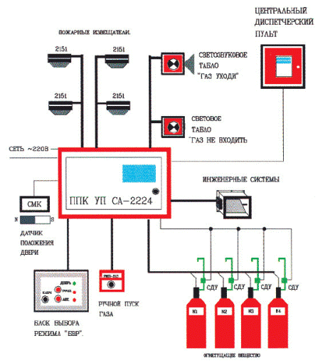 При наличии на защищаемом объекте системы пожарной сигнализации с контролем и управлением пожарной автоматикой инженерных систем правильно встраивать автономные установки газового пожаротушения в общую систему пожарной сигнализации с выводом всей информации на единый диспетчерский пульт.