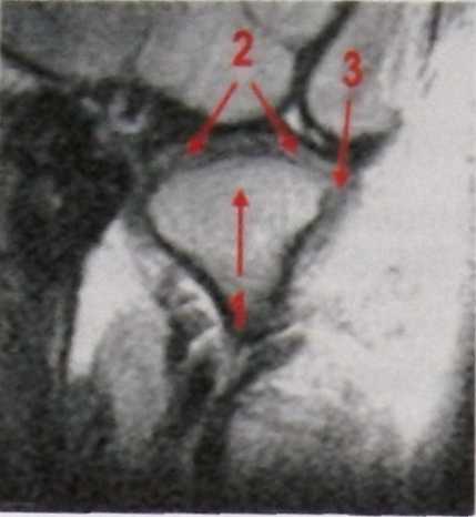 | Рис. 8.71. Т1 взвешенная томограмма ВНЧС в кософронтальной проекции: 1- мыщелок нижней челюсти; 2- внутрисуставной диск; 3- латеральная коллатеральная связка |