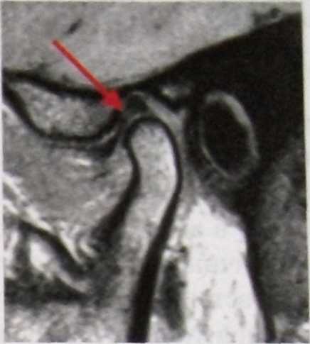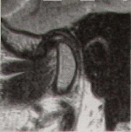 На Т1 взвешенных кососагиттальных томограммах с открытым до 3 см ртом (рис. 8.72) верхушка мыщелка определяется непосредственно под верхушкой суставного бугорка, промежуточная зона диска разобщает верхушки бугорка и мыщелка.