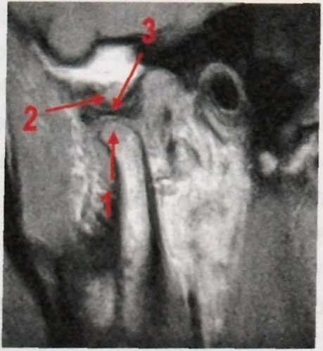 | Рис.8.72. Т1 взвешенная томограмма ВНЧС в кососагиттальной проекции с открытым на З см ртом; 1 - мыщелок нижней челюсти; 2- уставной бугорок височной кости; 3- промежуточная зона диска |