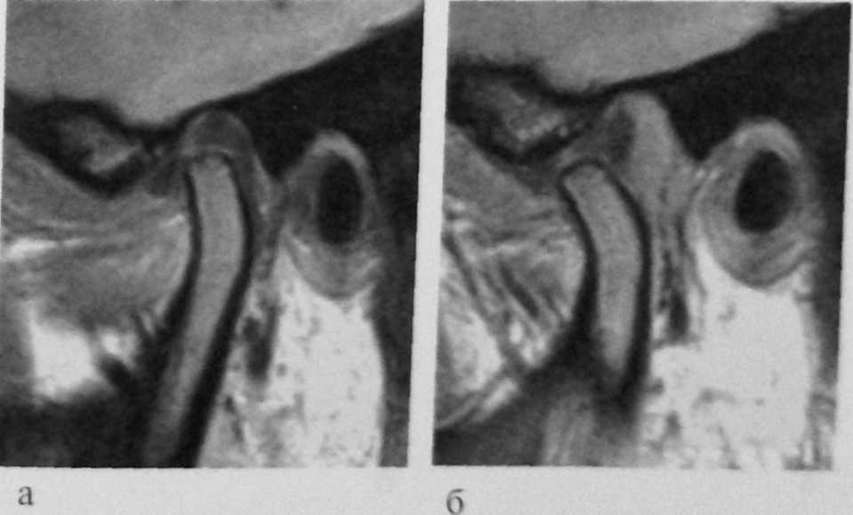 | Рис. 8.74. Т1 взвешенная МРТ ВНЧС в кососагиттальной проекции. Перфорация диска в промежуточной зоне, где диск фрагментарно не визуализируется: а - положение окклюзии; б - максимально открытый рот (ограничение смещаемости мыщелка) |