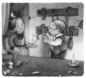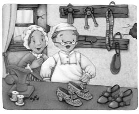“Two elves have been making the shoes!” said the shoemaker. “Did you see their tattered clothes? Let’s make them some new ones to say thank you,” said his wife.