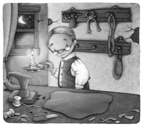 The shoemaker put the leather on his table. “Tomorrow, I will make one last pair of shoes to sell at the market,” he said sadly.