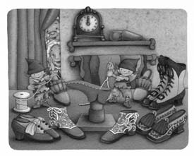 When the clock struck midnight, in came two little elves. Zippity, zip! They made 100 pairs of the fanciest shoes ever seen. Then they danced a joyful jig and left.