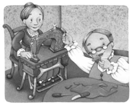 All day, the shoemaker and his wife worked and worked. She made two tiny outfits. He made two tiny pairs of shoes.