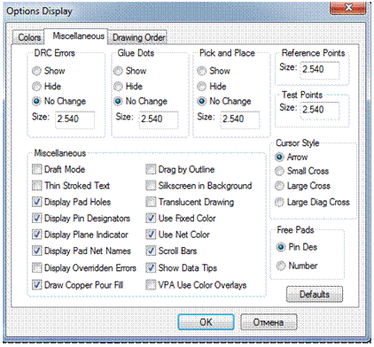 По команде основного меню Options>Display в окне Options Display на двух вкладках можно задать цвета и стили отображения различных объектов разрабатываемой печатной платы. С помощью вкладки Colors (цвета) можно изменять цвета отдельных элементов изображения на каждом из слоев. Вкладка Miscellaneous позволяет выбрать режимы отображения и размеры дополнительных элементов, стиль отображения курсора и другие параметры (рис. 3.7, табл. 3.2).