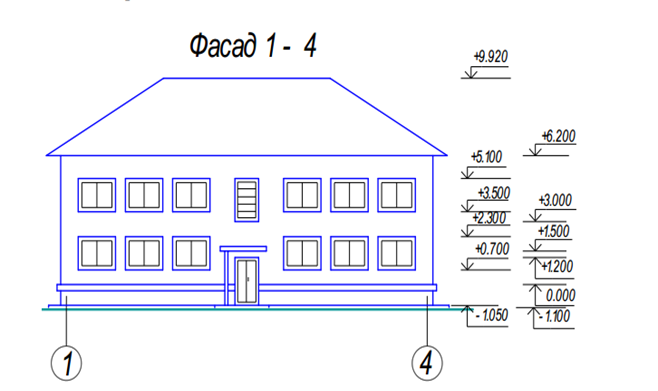 по краям фасада, в местах уступов в плане и перепадов высот здания. На чертежах фасадов указывают отметки уровня земли, верха стен, входных площадок, низа и верха проемов и других элементов фасада, расположенных в разных уровнях. Полочку отметки желательно развернуть в сторону от изображения. Пример оформления фасада представлен на рис. 1