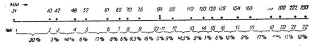 Было проведено около 70 опытов. Метрономические данные, соответствующие каждому этапу ускорения или замедления, осуществляемого музыкантом-экспертом, фиксировались в виде точек над шкалой темпа. Вот, например, какими шагами производилось ускорение в одном из опытов:
