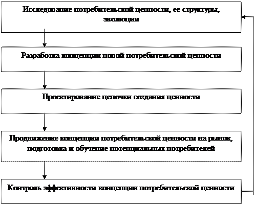 Первой функцией маркетинга в рамках цепочки создания ценности является функция разработки концепции создания потребительской ценности. Данная функция на первый взгляд аналогична функции традиционного маркетинга, связанной с разработкой идеи товара. Однако, она существенно сложнее, поскольку, как было показано выше, понятие потребительской ценности существенно шире и требует наличия знаний не только в области использования конкретного товара, но и знаний, связанных с решением покупательских проблем, то есть разработкой технологий потребления, формирующих будущий образ жизни покупателей.