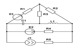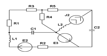 | Составить уравнения контурных токов и узловых напряжений и решить их для численных значений: R1=R2=R3= XC1=100 Ом XL1= XL2=25 Ом E1(t)=3coswt,В; J 1(t)=30coswt,мА; E2(t)=3coswt,В; E3(t)=5coswt, В.; | ||||