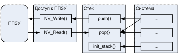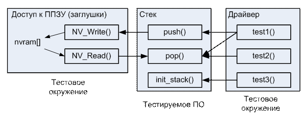 Схема взаимодействия тестируемого ПО (функций работы со стеком) с реальным окружением (основной частью системы и модулем работы с ППЗУ) и тестовым окружением (драйвером и заглушками функций работы с ППЗУ) показана на Рис. 10 и Рис. 11.