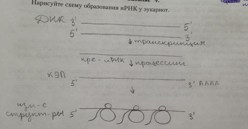 У эукариот новосинтезиров иРНК претерпев посттранскрипц измен-я-процессинг. К 5' концу пре-иРНК присоедин кэп-метилированный гуанозинтрифосфат. К 3' концу присоедин фрагмент, состоящ из 100-300 адениловых нуклеотидов –поли-А последоват-ть. Кэпирование(присоед-е кэп) и полиаденилиров-е (присоед-е поли-А последоват-ти) происх в ядре в момент оконч-я синтеза иРНК. В рез-те образ-ся пре-иРНК, к-ая им следующее строение: на 5' конце наход кэп, за ним неинформативная последоват-ть, инициирующий кодон АУГ, далее – отрезок, где информативные уч-ки – экзоны – черед-ся с неинформативными – интронами. Этот отрезок заканчив стоп-кодоном, за к-рым идёт неинформативная последоват-ть и поли-А последоват-ть. У эукариот в ядре происх сплайсинг – вырез-е интронов и сшивание экзонов.